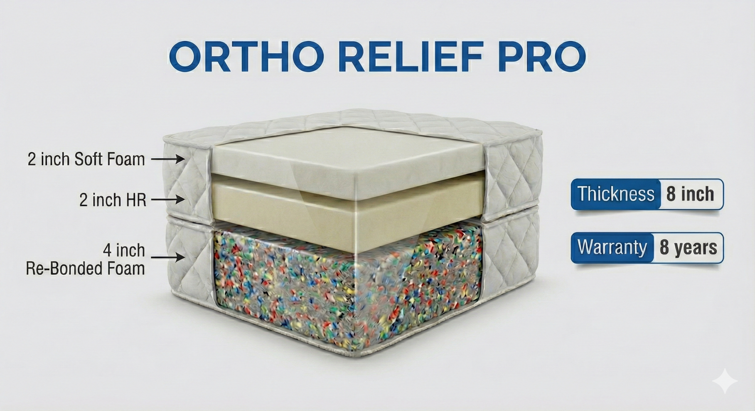 Experience Pain-Free Sleep with ORTHO RELIEF PRO Invest in your health with a mattress designed specifically for orthopedic support. The ORTHO RELIEF PRO combines advanced foam technology to ensure your body is perfectly supported throughout the night, reducing pressure points and morning stiffness.