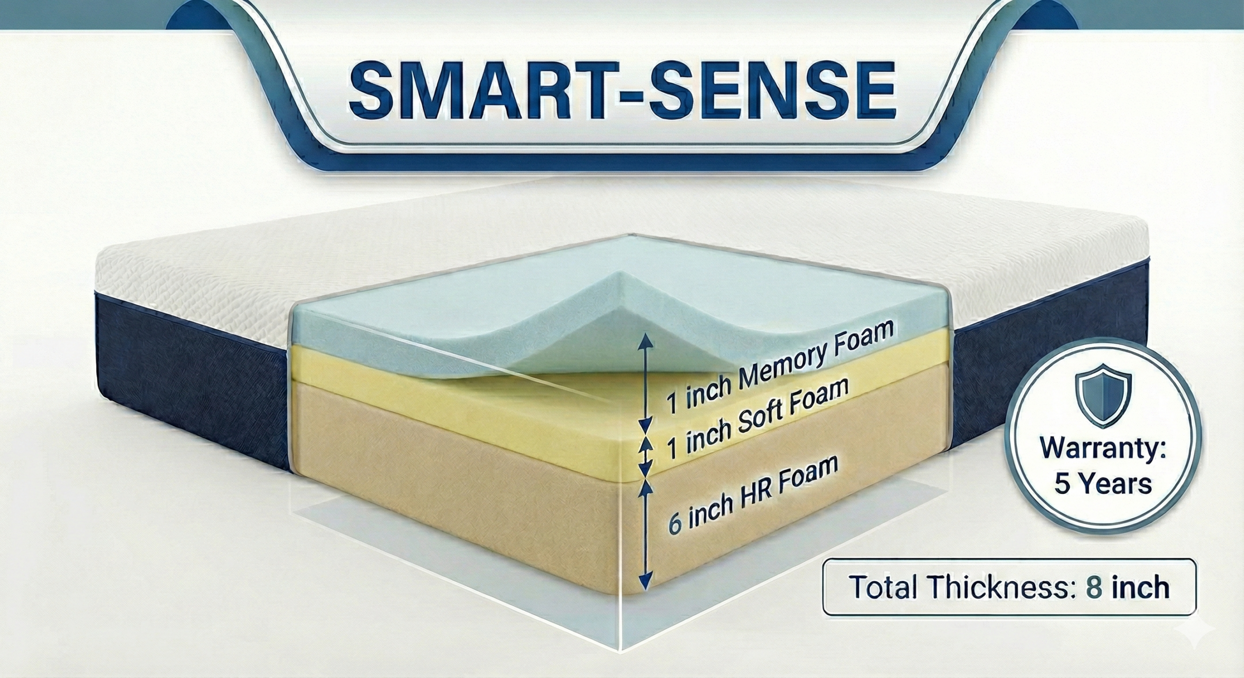 + Free ShippingExperience Intelligent Comfort & Support The SMART-SENSE 8-inch Mattress is engineered for those who seek the perfect balance of plush comfort and deep-down support. Featuring a sophisticated triple-layer design—1″ Memory Foam, 1″ Soft Foam, and a robust 6″ HR Foam base—this mattress adapts to your body’s unique shape while ensuring optimal spinal alignment. Enjoy a cooler, more restful sleep with a premium finish and a 5-year warranty for peace of mind.