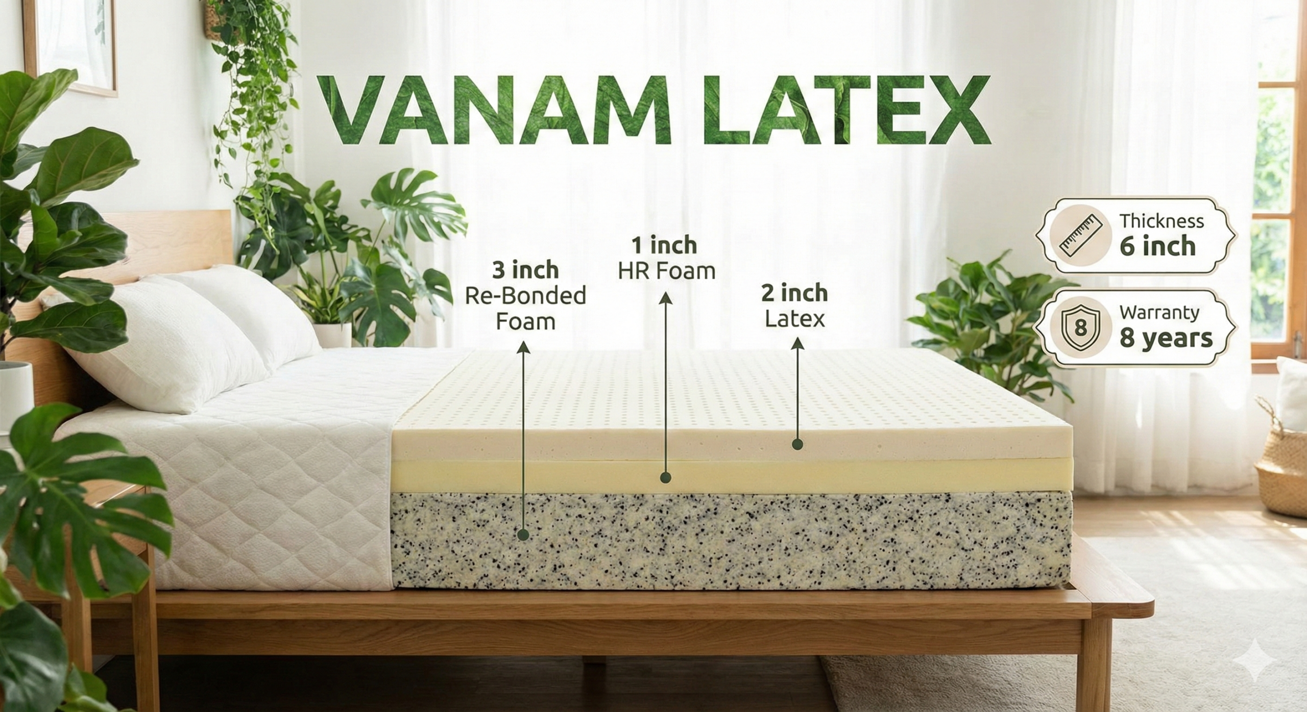 ₹11,165.00 – ₹25,850.00Price range: ₹11,165.00 through ₹25,850.00Select options This product has multiple variants. The options may be chosen on the product pageThe VANAM LATEX is a premium 8-inch hybrid mattress featuring a natural 2-inch Latex top for breathable comfort, a 2-inch HR foam transition layer, and a high-density 4-inch Re-Bonded foam base. It offers medium-firm support, superior durability, and an industry-leading 8-year warranty.